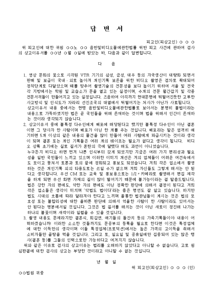 상고이유서 내용 중에서는 현행 음반및비디오물에관한법률로 보아서는 분명히 불법이라는 내용으로 가득하였지만 법은 곧 국민들을 위해 존재하는 것이며 법을 위해서 인간이 존재하는 것이라 생각되지 않습니다.