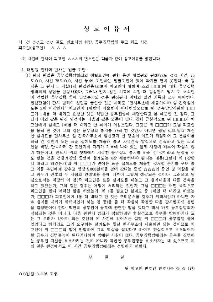 상고이유서(변호사)(6) 예제 입니다. 1. 대법원 판례에 반하는 법률 위반 (1) 원심 판결은 공무집행방해죄의 성립요건에 관한 종전 대법원의 판례(72도 사건, 75도 , 사건 76도 , 사건 등)에 위반하는 법률위반이 있어 파기를 면치 못한다. 즉 원심은 그 판시 1. 사실(1심 판결인용)으로서 피고인에 대하여 소외 □□□에 대한 공무집행 방해죄의 성립을 인정하였다. 그러나 먼저 일건 기록에 의할 때 원심판시 당시 위 소외인이 적법한
