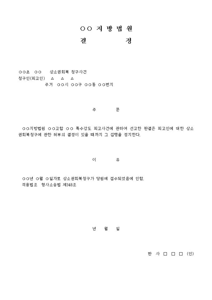 상소권회복청구에따른재판집행정지결정 입니다. 주 문 지방법원 고합 특수강도 피고사건에 관하여 선고한 판결은 피고인에 대한 상소권회복청구에 관한 허부의 결정이 있을 때까지 그 집행을 정지한다. 이 유 년 월 일자로 상소권회복청구가 당원에 접수되었음에 인함. 적용법조 형사소송법 제348조 ...