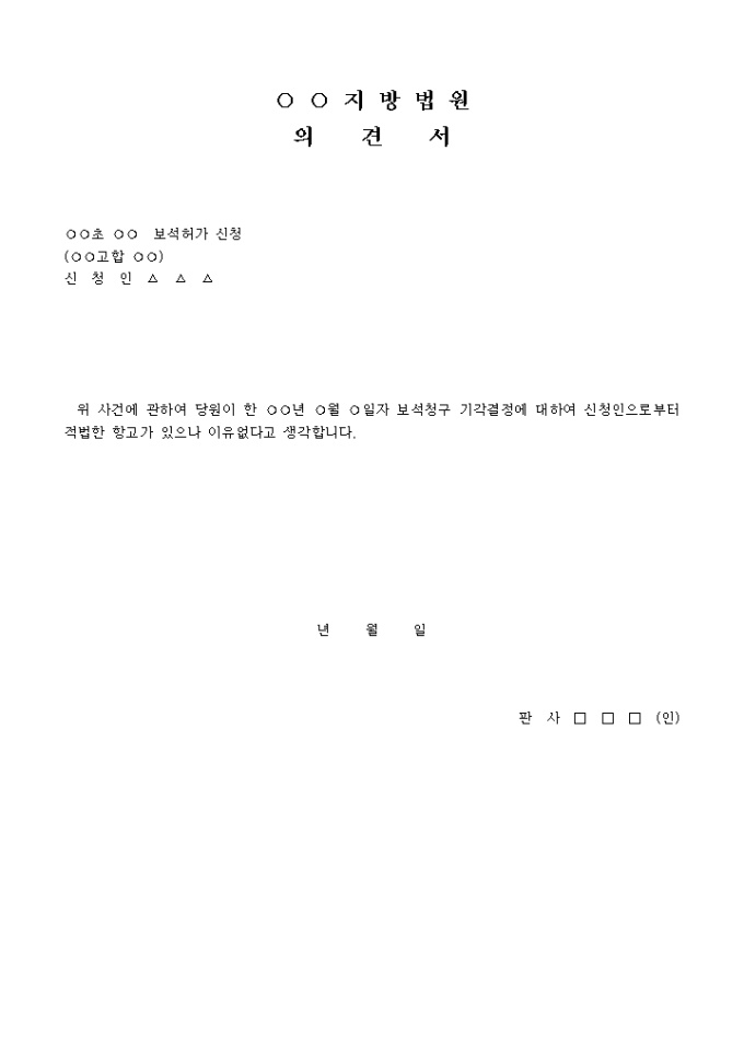의견서 입니다. 위 사건에 관하여 당원이 한 ○○년 ○월 ○일자 보석청구 기각결정에 대하여 신청인으로 부터 적법한 항고가 있으나 이유없다고 생각합니다. ...