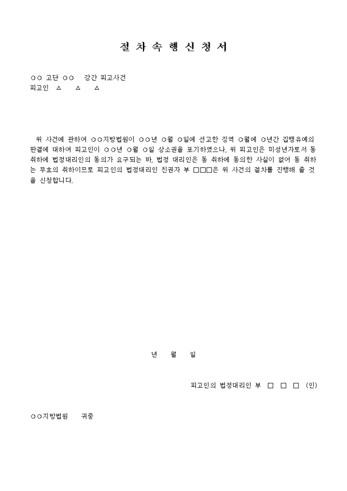 절차속행신청서(무효인상소권취하를다투는경우) 입니다. 위 사건에 관하여 ○○지방법원이 ○○년 ○월 ○일에 선고한 징역 ○월에 ○년간 집행유예의 판결에 대하여 피고인이 ○○년 ○월 ○일 상소권을 포기하였으나 , 위 피고인은 미성년자로서 동 취하에 법정대리인의 동의가 요구되는 바, 법정 대리인은 동 취하에 동의한 사실이 없어 동 취하는 무효의 취하이므로 피고인의 법정대리인 친권자 부 □□□은 위 사건의 절차를 진행해 줄 것을 신청합니다. ...