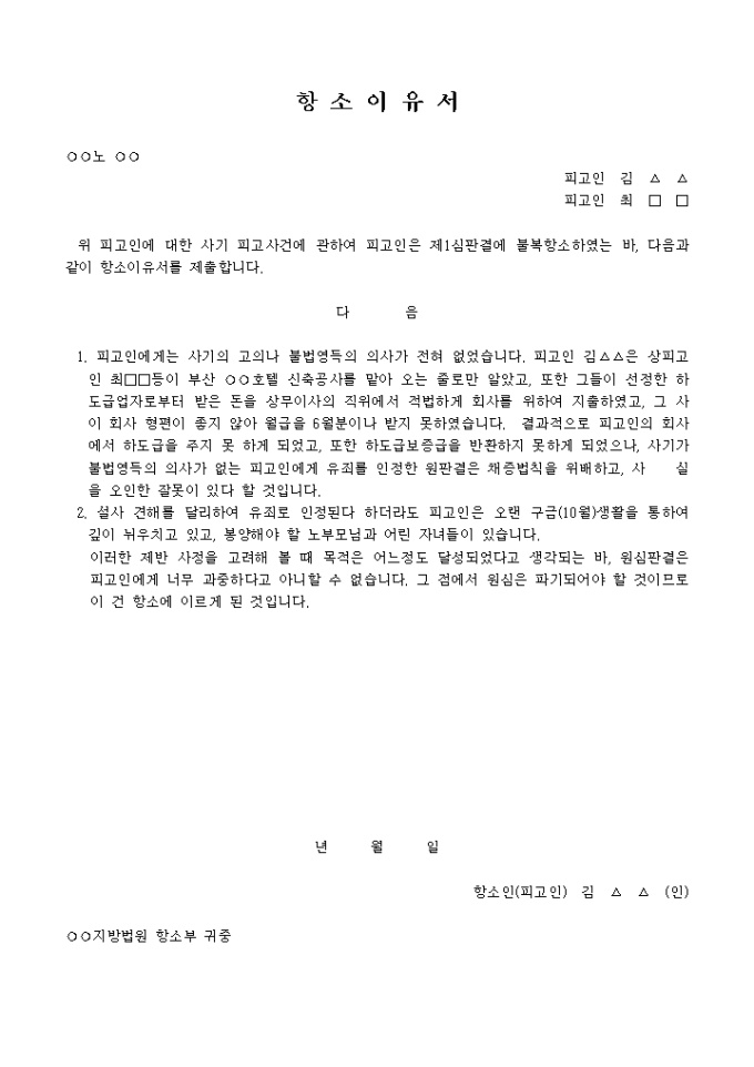9,000원/월항소이유서(피고인)(2) 입니다. 위 피고인에 대한 사기 피고사건에 관하여 피고인은 제1심판결에 불복항소하였는 바, 다음과 같이 항소이유서를 제출합니다. 다 음 1. 피고인에게는 사기의 고의나 불법영득의 의사가 전혀 없었습니다. 피고인 김△△은 상피고인 최□□등이 부산 ○○호텔 신축공사를 맡아 오는 줄로만 알았고, 또한 그들이 선정한 하도급업자로부터 받은 돈을 상무이사의 직위에서 적법하게 회사를 위하여 지출하였고, 그 사이 회
