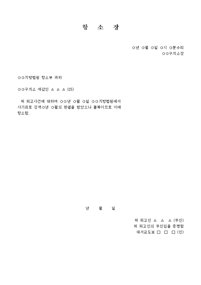 9,000원/월항소장(재감인) 입니다. 위 피고사건에 대하여 ○○년 ○월 ○일 ○○지방법원에서 사기죄로 징역○년 ○월의 판결을 받았으나 불복이므로 이에 항소함. ...