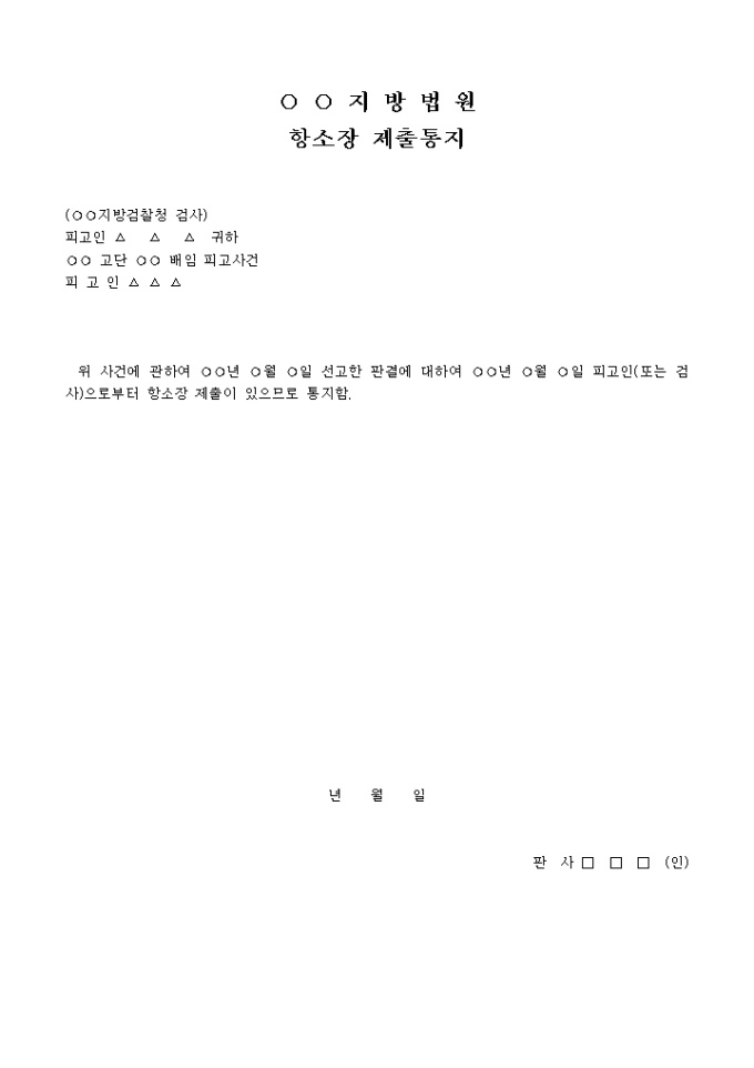 9,000원/월항소장제출통지서 입니다. 위 사건에 관하여 ○○년 ○월 ○일 선고한 판결에 대하여 ○○년 ○월 ○일 피고인(또는 검사)으로 부터 항소장 제출이 있으므로 통지함. ...