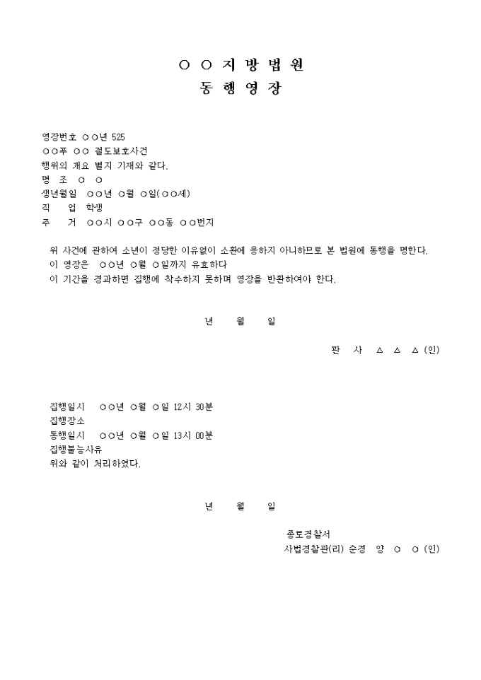 소년의동행영장 입니다. 위 사건에 관하여 소년이 정당한 이유없이 소환에 응하지 아니하므로 본 법원에 동행을 명한다. 이 영장은 년 월 일까지 유효하다 이 기간을 경과하면 집행에 착수하지 못하며 영장을 반환하여 야 한다. ...