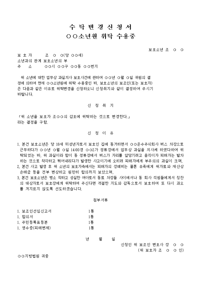 수탁변경신청서 입니다. 신 청 취 지 「위 소년을 보호자 조 의 감호에 위탁하는 것으로 변경한다.」 라는 결정을 구함. 신 청 이 유 1. 본건 보호소년은 당 18세 미성년자로서 보호인 집에 동거하면서 운수주식회사 버스 차장으로 근무하다가 년 월 일 14:00경 2가 정류장에서 업무상 과실을 치사케 하였다하여 위탁되었는 바, 위 과실이라 함이 동 정류장에서 버스가 자리를 앞당기려고 움직이자 피해자는 발차하