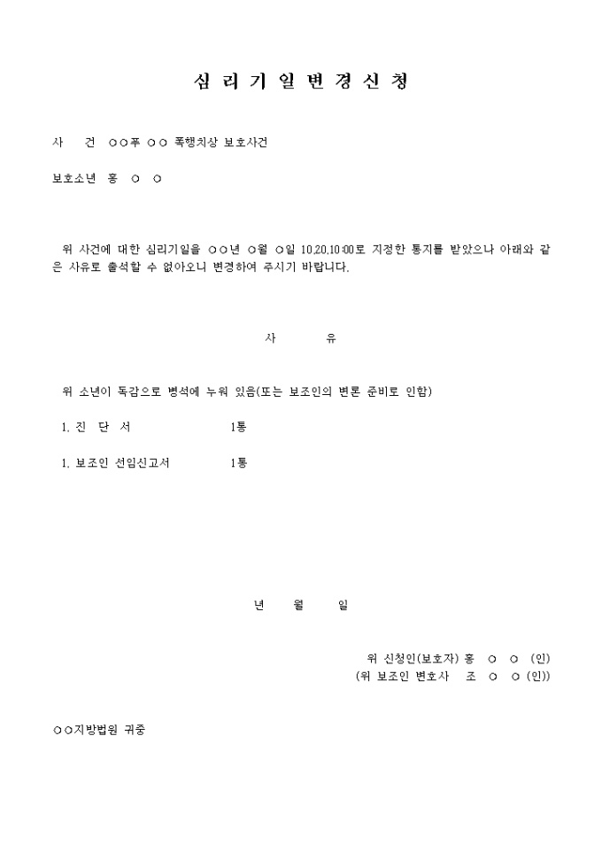 9,000원/월심리기일변경신청서 입니다. 위 사건에 대한 심리기일을 년 월 일 10.20.10:00로 지정한 통지를 받았으나 아래와 같은 사유로 출석할 수 없아오니 변경하여 주시기 바랍니다. 사 유 위 소년이 독감으로 병석에 누워 있음(또는 보조인의 변론 준비로 인함) ...