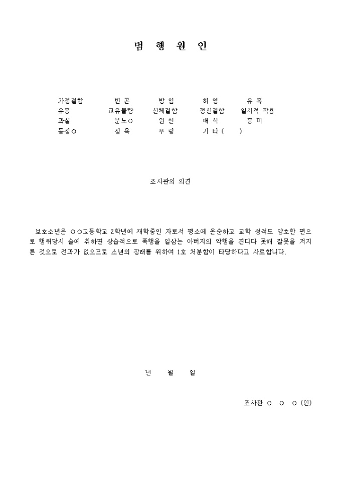 보호소년은 고등학교 2학년에 재학중인 자로서 평소에 온순하고 교학 성적도 양호한 편으로 행위당시 술에 취하면 상습적으로 폭행을 일삼는 아버지의 악행을 견디다 못해 잘못을 저지른 것으로 전과가 없으므로 소년의 장래를 위하여 1호 처분함이 타당하다고 사료합니다.