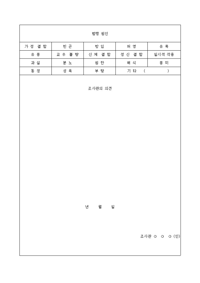 가정결함,빈곤,방임,허영,유혹,유흥,교우불량등의 항목으로 구성되었으며 조사관의 의견을 서술형식으로 기록하시는 양식입니다.