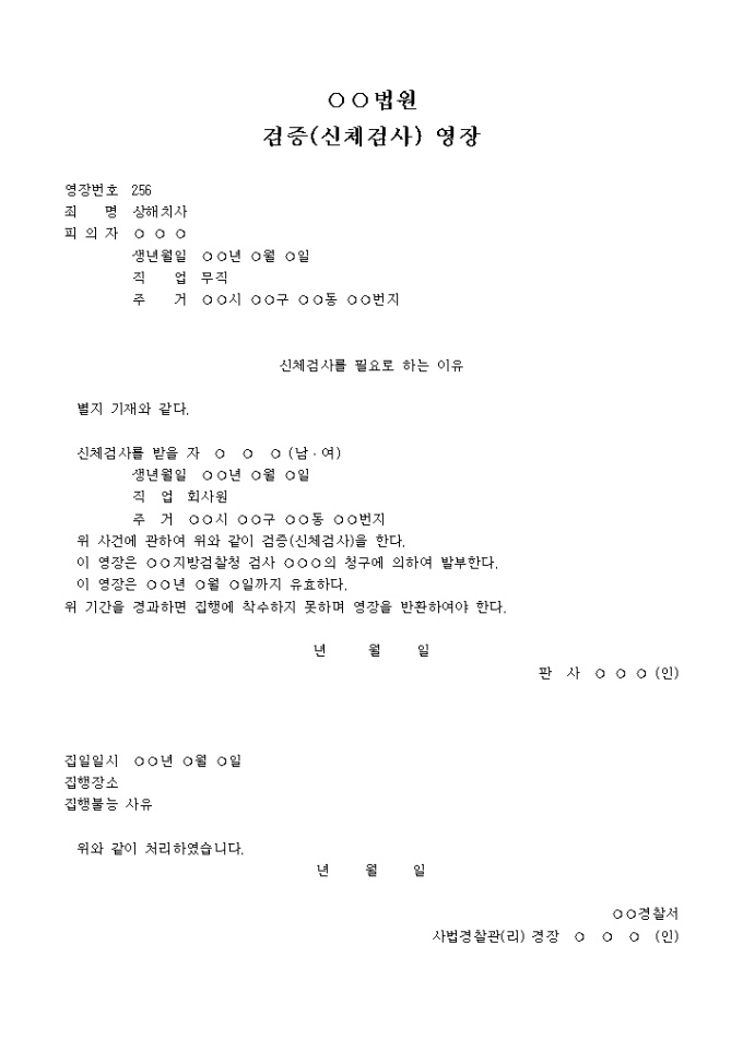 검증영장(신체검사의경우) 입니다. 위 사건에 관하여 위와 같이 검증(신체검사)을 한다. 이 영장은 지방검찰청 검사 의 청구에 의하여 발부한다. 이 영장은 년 월 일까지 유효하다. 위 기간을 경과하면 집행에 착수하지 못하며 영장을 반환하여 야 한다. ...