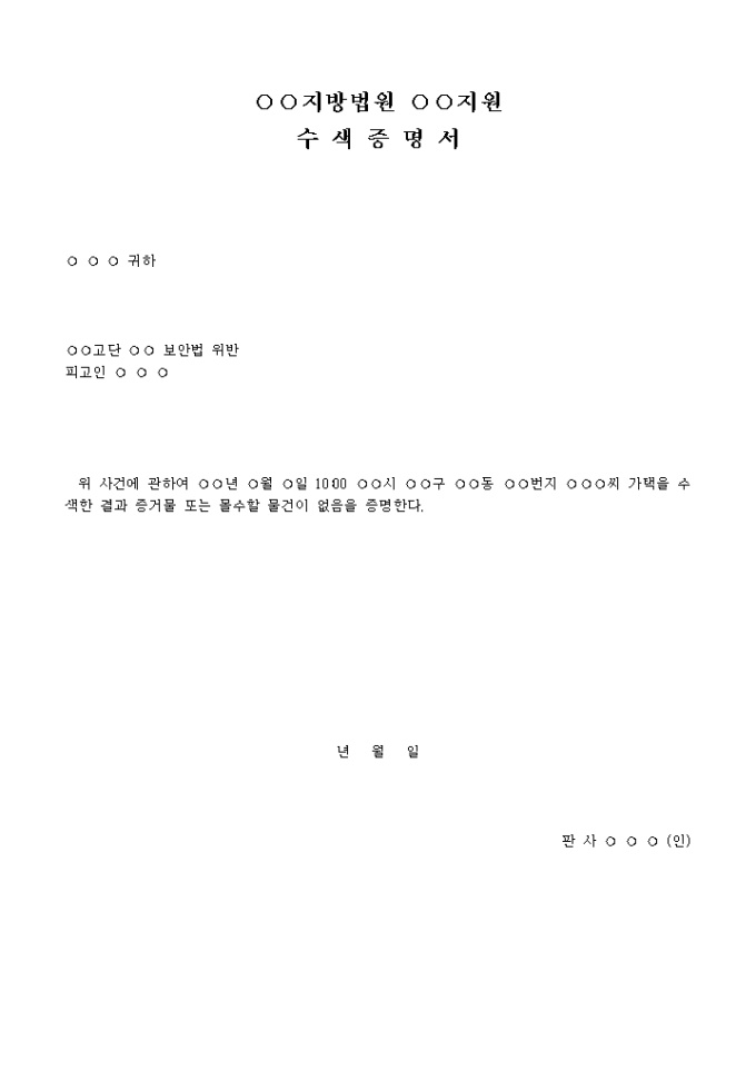 수색증명서 입니다. 위 사건에 관하여 ○○년 ○월 ○일 10:00 ○○시 ○○구 ○○동 ○○번지 ○○○씨 가택을 수색한 결과 증거물 또는 몰수할 물건이 없음을 증명한다. ...