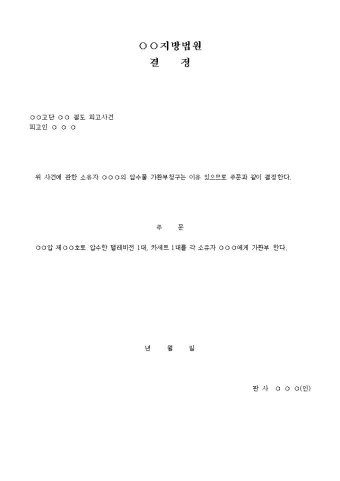 압수물가환부결정(1)(소유자) 입니다. 위 사건에 관한 소유자 의 압수물 가환부청구는 이유 있으므로 주문과 같이 결정한다. 주 문 압 제 호로 압수한 텔레비전 1대, 카세트 1대를 각 소유자 에게 가환부 한다. ...