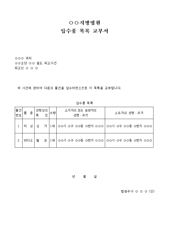 압수품목록교부서 입니다. 위 사건에 관하여 다음의 물건을 압수하였으므로 이 목록을 교부합니다. ...