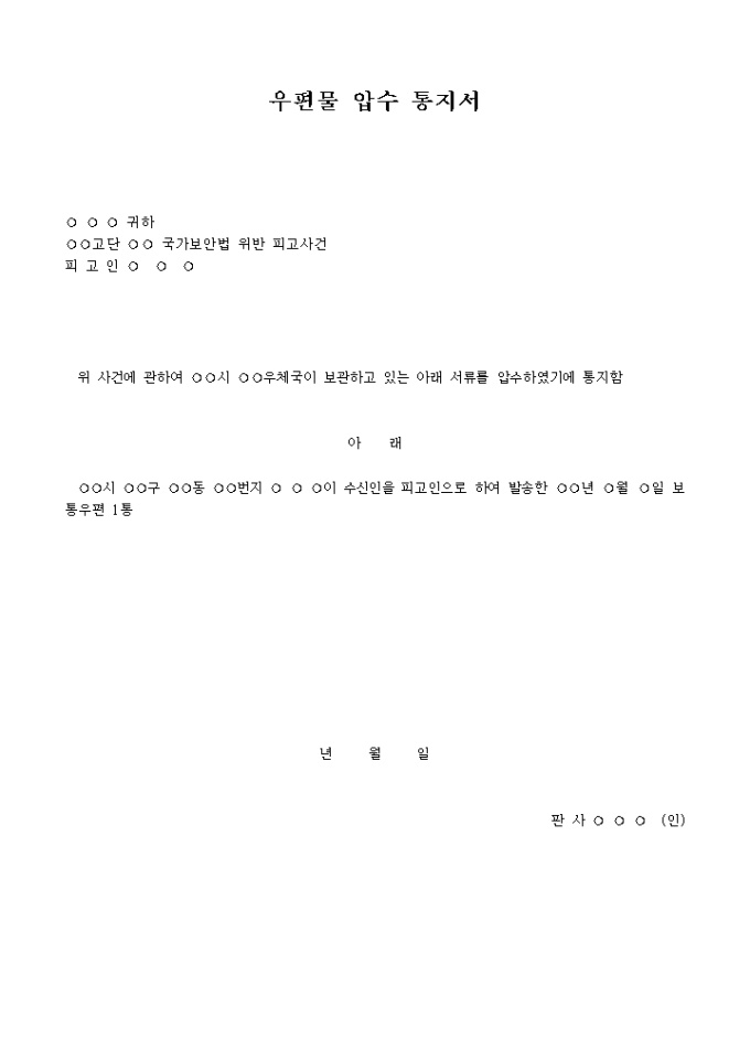 9,000원/월우편물압수통지서 입니다. 위 사건에 관하여 시 우체국이 보관하고 있는 아래 서류를 압수하였기에 통지함 아 래 시 구 동 번지 이 수신인을 피고인으로 하여 발송한 년 월 일 보통우편 1통 ...