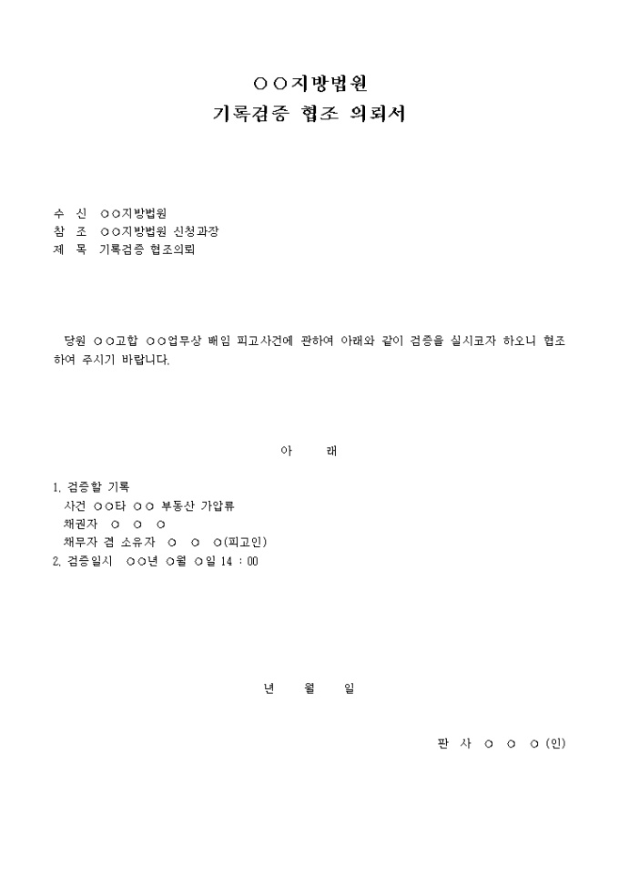 기록검증협조의뢰서 입니다. 당원 ○○고합 ○○업무상 배임 피고사건에 관하여 아래와 같이 검증을 실시코자 하오니 협조하여 주시기 바랍니다. ...