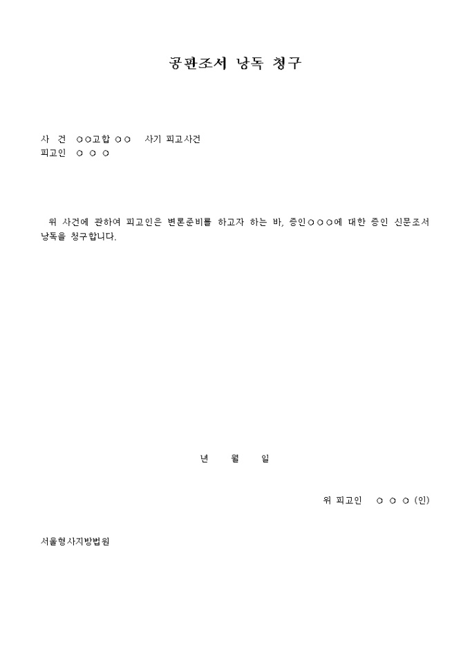 공판조서낭독청구서 입니다. 사 건 고합 사기 피고사건 피고인 위 사건에 관하여 피고인은 변론준비를 하고자 하는 바, 증인 에 대한 증인 신문조서 낭독을 청구합니다. ...