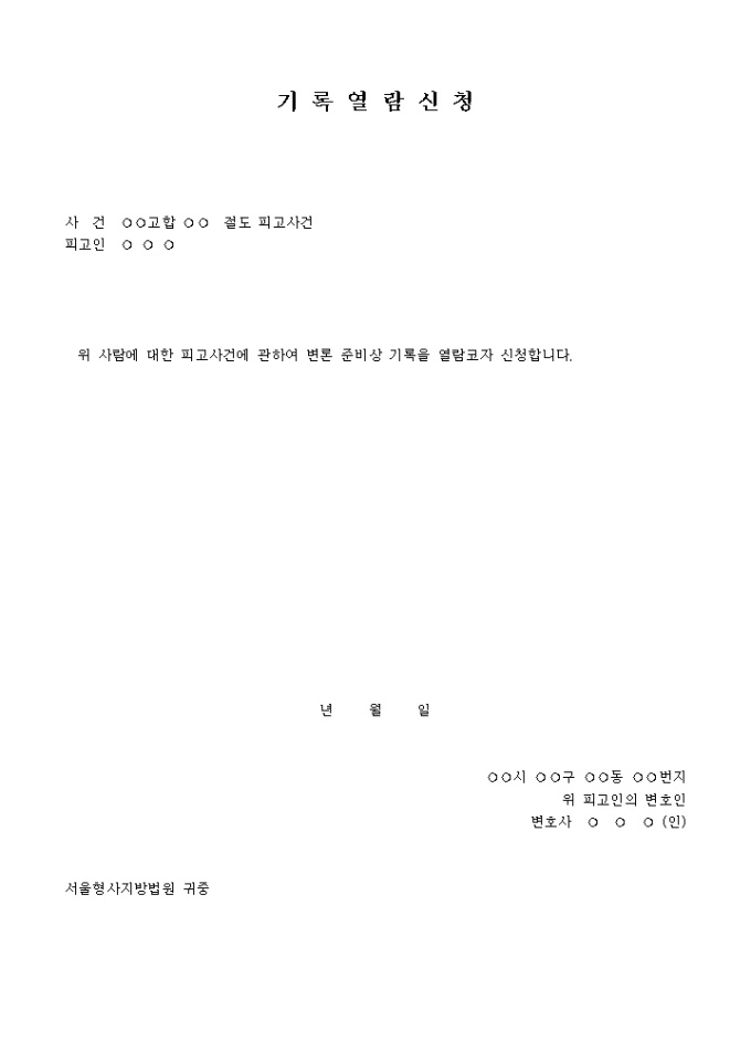 기록열람신청서 입니다. 사 건 ○○고합 ○○ 절도 피고사건 피고인 ○ ○ ○ 위 사람에 대한 피고사건에 관하여 변론 준비상 기록을 열람코자 신청합니다. ...