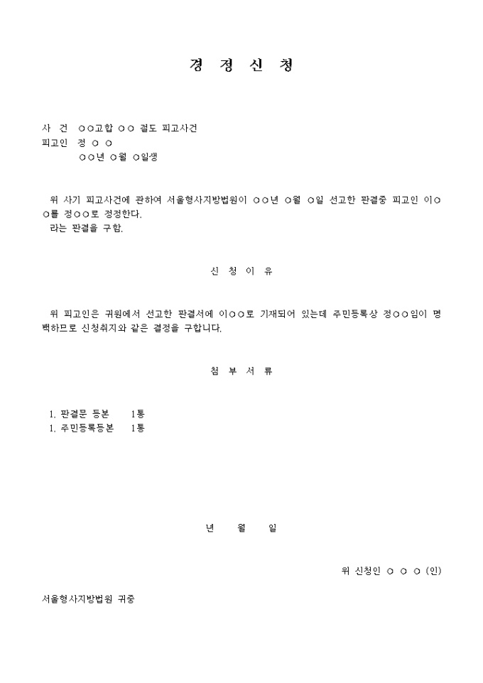 9,000원/월재판서경정신청서 입니다. 위 사기 피고사건에 관하여 서울형사지방법원이 ○○년 ○월 ○일 선고한 판결중 피고인 이○○를 정○○로 정정한다. 라는 판결을 구함. 신 청 이 유 위 피고인은 귀원에서 선고한 판결서에 이○○로 기재되어 있는데 주민등록상 정○○임이 명백하므로 신청취지와 같은 결정을 구합니다. ...