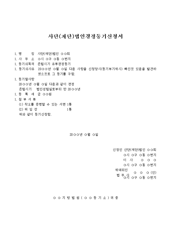 신청당시(등기부기재시) 빠진것 있음을 발견하였으므로 그 등기를 구하기 위한 사단(재단)법인경정등기신청서양식입니다.
