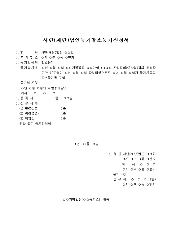 사원총회(이사회)결의 무효확인(취소)판결이 확정되었으므로 등기사항의 말소등기를 구하기 위한 사단(재단)법인등기말소등기신청서양식입니다.
