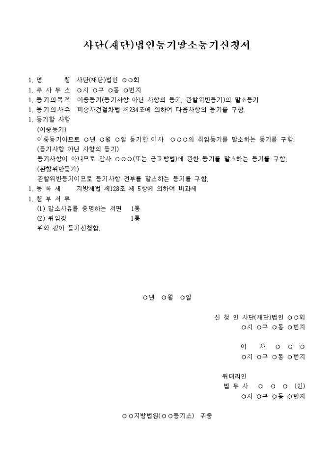 비송사건절차법 제234조에 의하여 등기를 구하기 위한 사단(재단)법인말소등기신청서양식입니다.