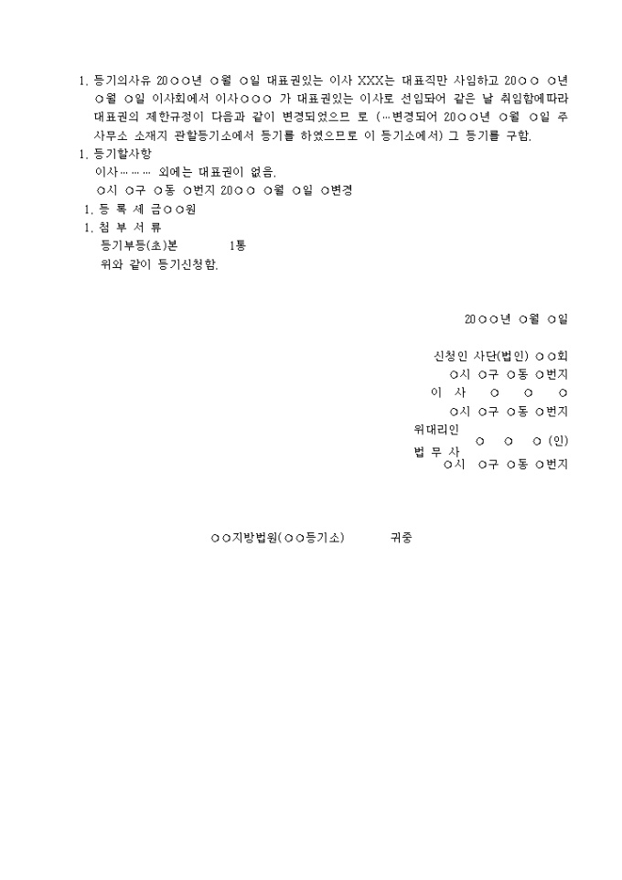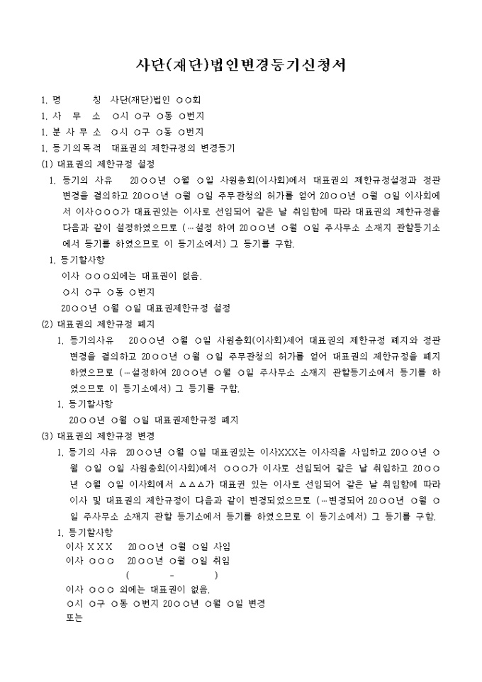 9,000원/월대표권의 제한규정의 변경을 위한 사단(재단)법인변경등기신청서양식입니다.