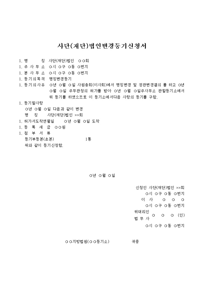 9,000원/월명칭변경 및 정관변경결의 를 하고 주무관청의 허가를 받아 주사무소 관할등기소에서 위 등기를 하였으므로 이 등기소에서다음 사항의 등기를 구하기 위한 사단(재단)법인변경등기신청서양식입니다.