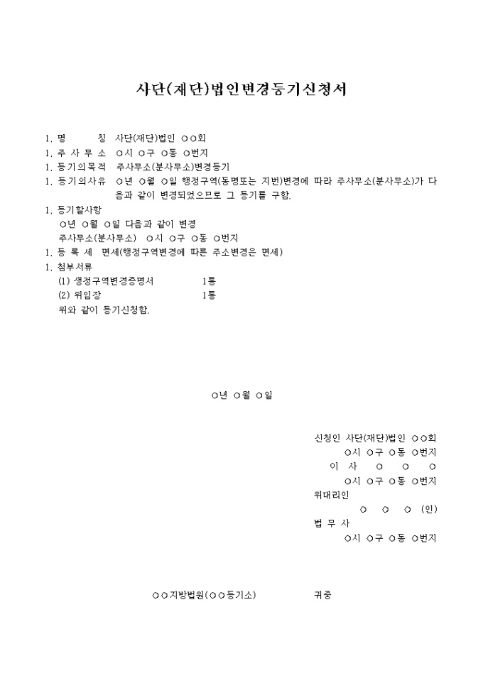 9,000원/월주사무소(분사무소)변경을 위한 사단(재단)법인변경등기신청서양식입니다.