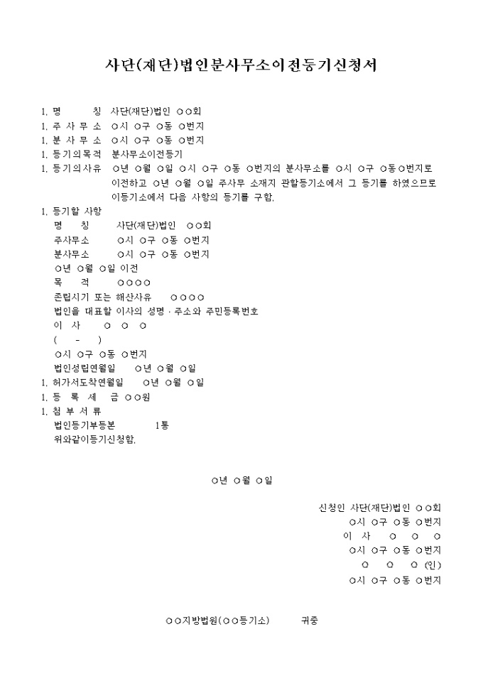 분사무소이전을 위한 사단(재단)법인분사무소이전등기신청서양식입니다.