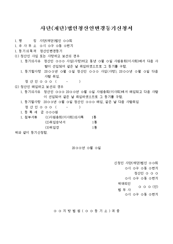 9,000원/월청산인변경을 위한 사단(재단)법인청산인변경등기신청서(청산인의 사임·해임·사망으로 보선의 경우 주사무소 소재지에서)양식입니다.