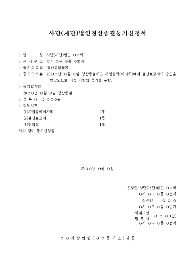 9,000원/월청산종결을 위한 사단(재단)법인청산종결등기신청서(주사무소 소재지)양식입니다.