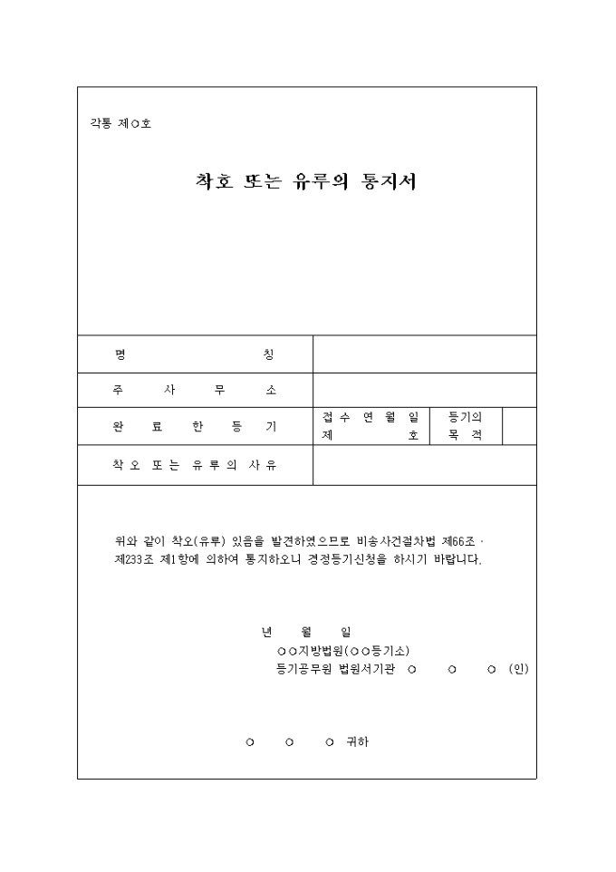 착오(유루) 있음을 발견하였으므로 비송사건절차법 제66조ㆍ제233조 제1항에 의하여 통지할 때 사용하는 양식입니다.