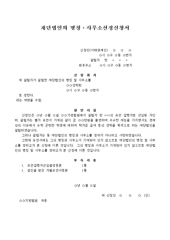 9,000원/월유언에 의한 정관에 관하여 유언집행자로부터 그 재단법인의 명칭·사무소의 선정을 할 때 사용하는 신청서 양식입니다.