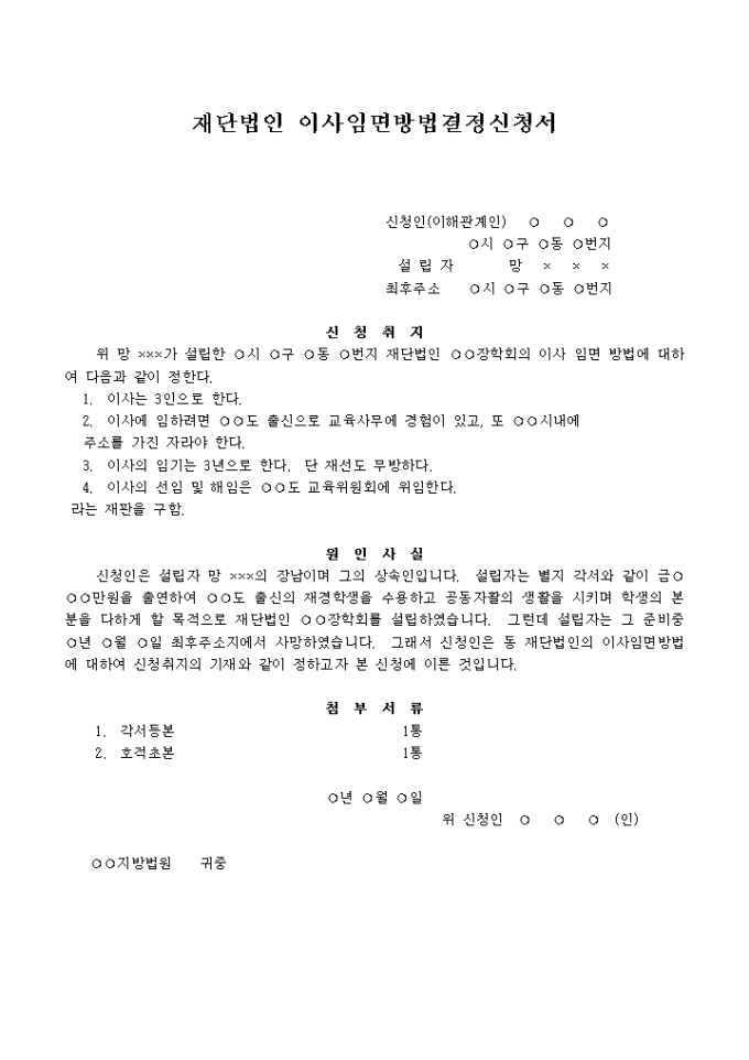 이사임면의 방법에 관한 정함이 없는(설립자 사망으로) 재단법인의 이사임면방법결정신청서 양식입니다.