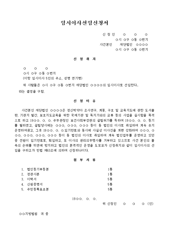9,000원/월재단법인 임시이사 선임을 위한 신청서 양식입니다.