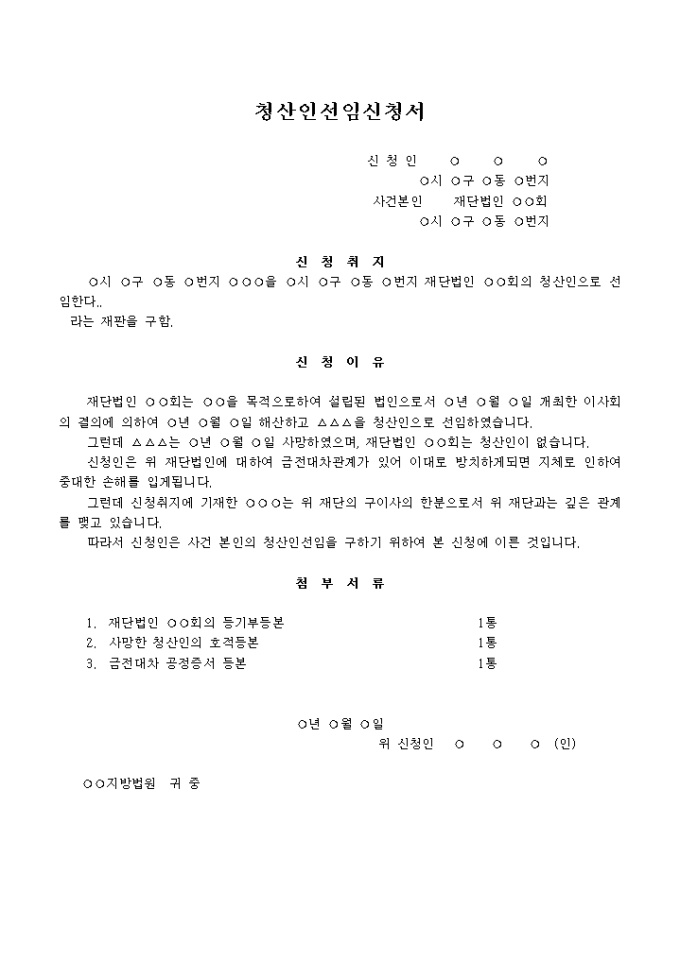 9,000원/월재단법인회는 이사회의 결의에 의하여 명시된 날짜에 해산하고 기재된 사람을 청산인으로 선임하할 때 사용하는 신청서 양식입니다.