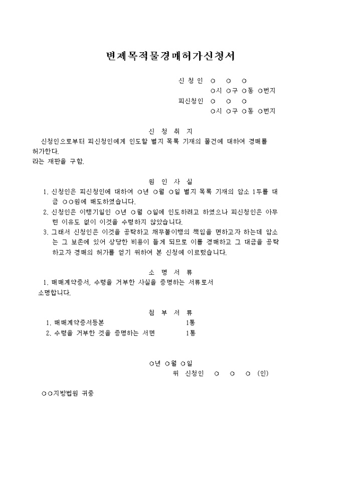 변제 목적물 경매 허가신청서