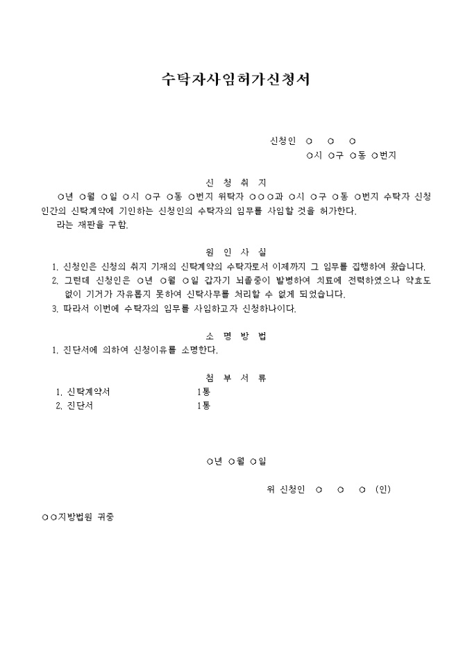 9,000원/월위탁자와 수탁자 신청인간의 신탁계약에 기인하는 신청인의 수탁자의 임무를 사임할 것을 허가요청할 때 사용하는 신청서 양식입니다.
