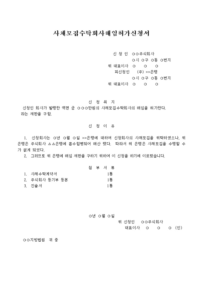 9,000원/월신청인 회사가 발행한 액면 금 ○○○만원의 사채모집수탁회사의 해임을 허가 신청할 때 사용하는 양식입니다.