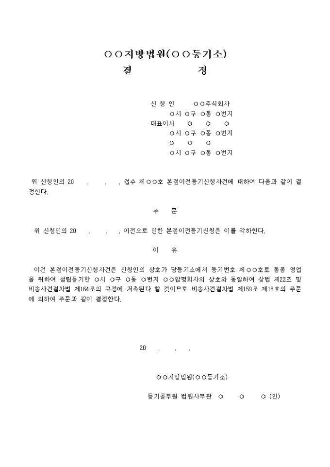 본점이전등기신청사건에 대하여 각하하기로 결정할 때 사용하는 양식입니다.