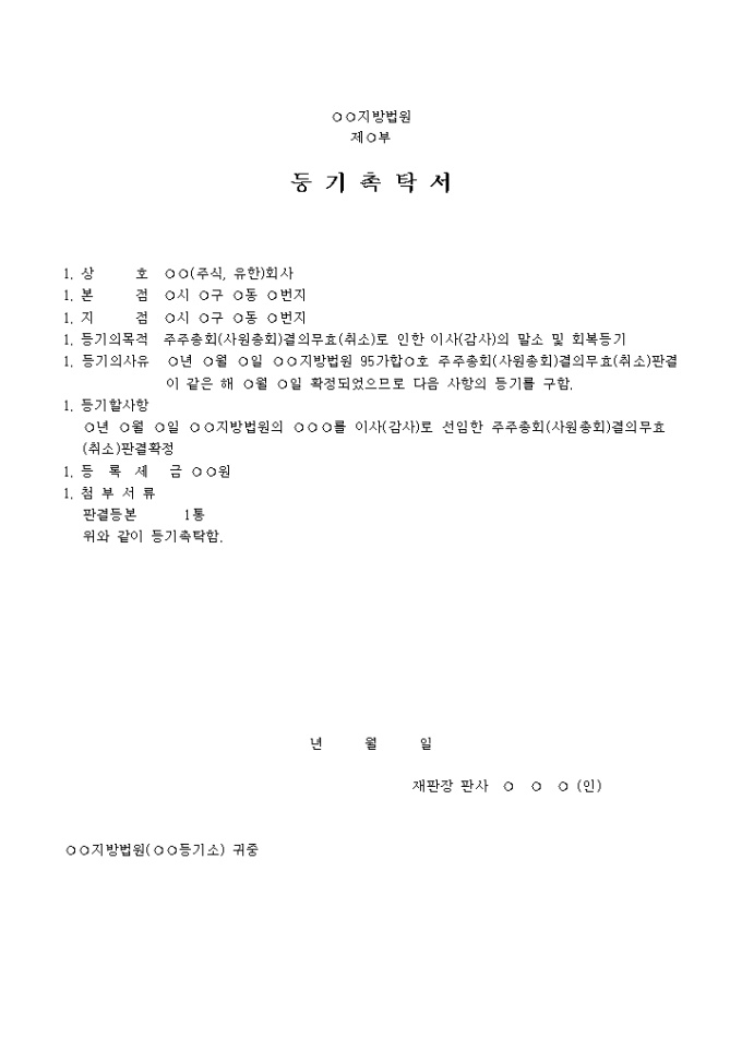 9,000원/월주주총회(사원총회)결의무효(취소)로 인한 이사(감사)의 말소 및 회복을 위한 등기촉탁서양식입니다.