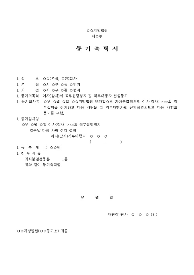 등기촉탁서(이사나 감사의 직무집행을 정지하고 그 직무대행자를 선임한 경우)