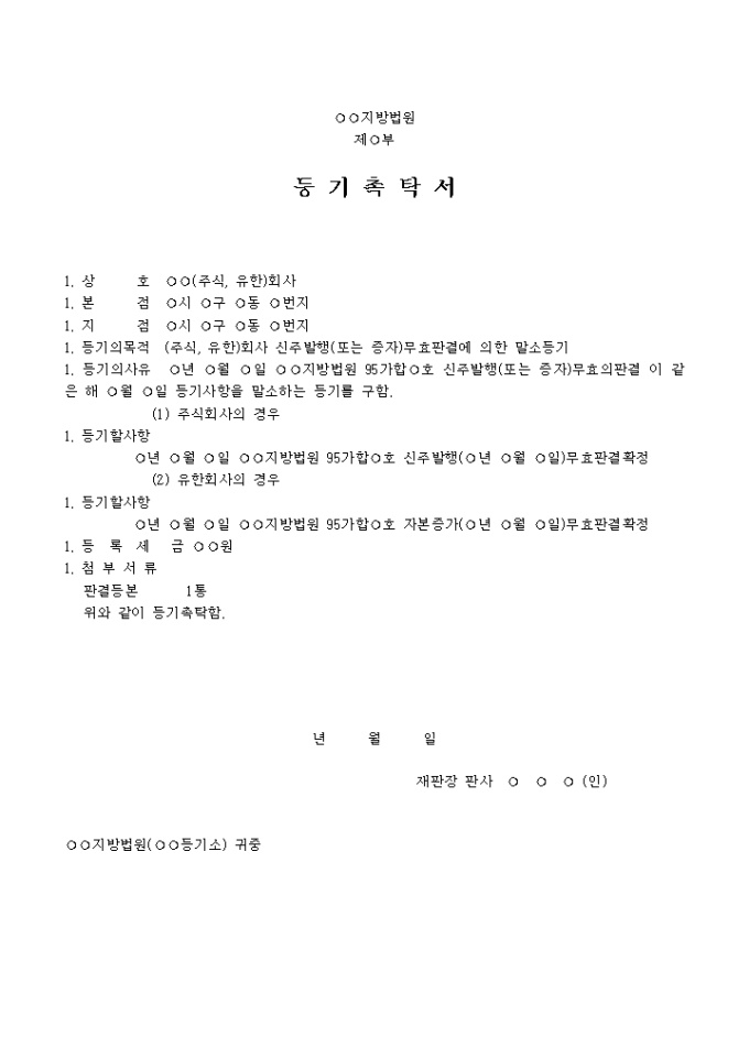 9,000원/월(주식, 유한)회사 신주발행(또는 증자)무효판결에 의한 말소를 위한 등기촉탁서양식입니다.