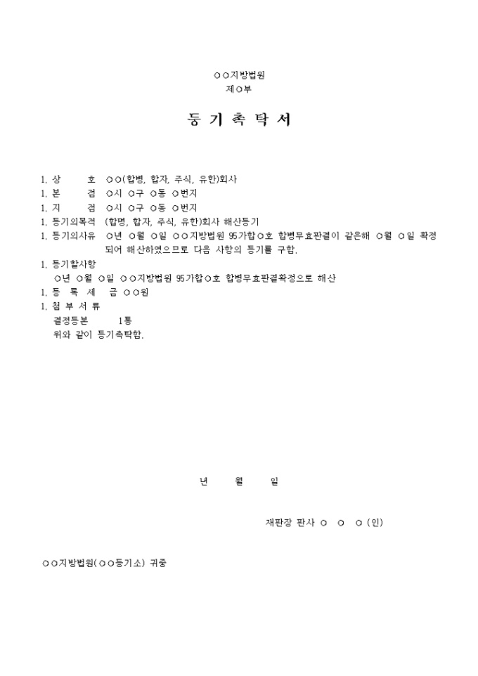 (합명, 합자, 주식, 유한)회사 해산을 위한 등기촉탁서양식입니다.
