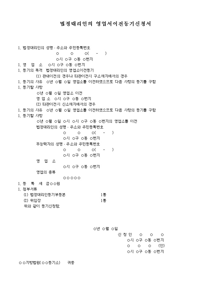 법정대리인의 영업소이전(관내이전의 경우나 타관이전시 구소재지에서의 경우)을 위한 법정대리인의 영업소이전등기신청서양식입니다.