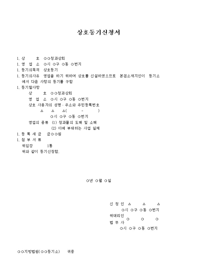 영업을 하기 위하여 상호를 신설하였으므로 본점소재지인이 등기소에서 그에 대한 등기를 구할 때 사용하는 상호등기신청서양식입니다.