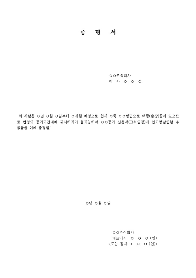 9,000원/월현재 특정국 방면으로 여행(출장)중에 있으므로 법정의 등기기간내에 귀사하기가 불가능하여 등기 신청서(그위임장)에 연기명날인할 수 없음을 증명할 때 사용하는 양식입니다.