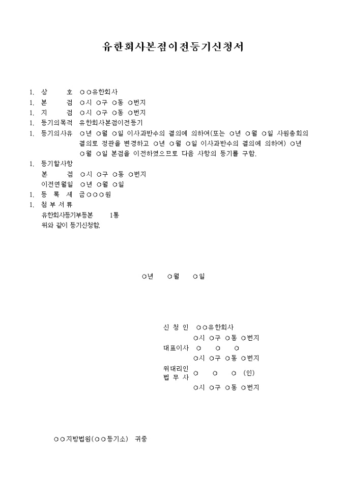 9,000원/월이사과반수의 결의에 의하여 또는 사원총회의 결의로 정관을 변경하고 이사과반수의 결의에 의하여 본점을 이전하였으므로 그에 대한 등기를 구할 때 사용하는 유한회사본점이전등기신청서양식입니다.