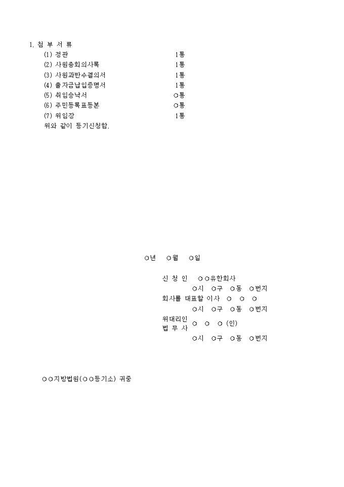 9,000원/월정관을 작성하여 공증인의 인증을 받고 출자전액을 납입하였으므로 (현물출자가 있는 경우에는 출자전액을 납입하고 현물출자의 목적재산 전부를 급여하였으므로) 그에 대한 등기를 구할 때 사용하는 유한회사설립등기신청서 양식입니다.