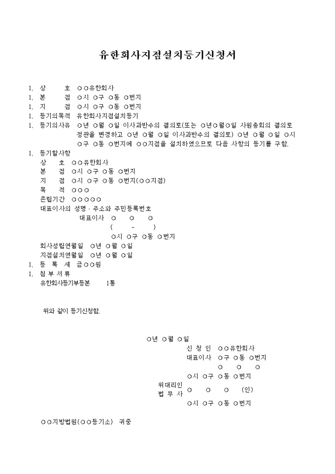 이사과반수의 결의로 또는 사원총회의 결의로 정관을 변경하고 이사과반수의 결의로 지점을 설치하였으므로 이에 대한 등기를 구할 때 사용하는 유한회사지점설치등기신청서양식입니다.